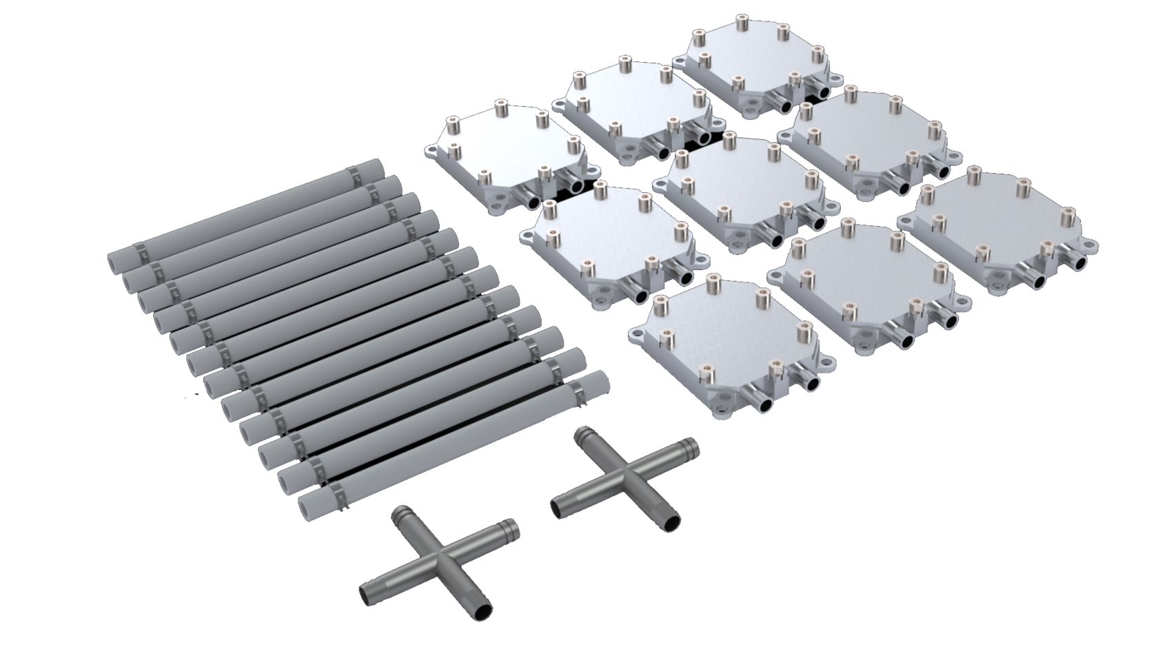 Kit includes: 9 waterblocks, 2 manifolds, 12 silicone tubes, clamps.